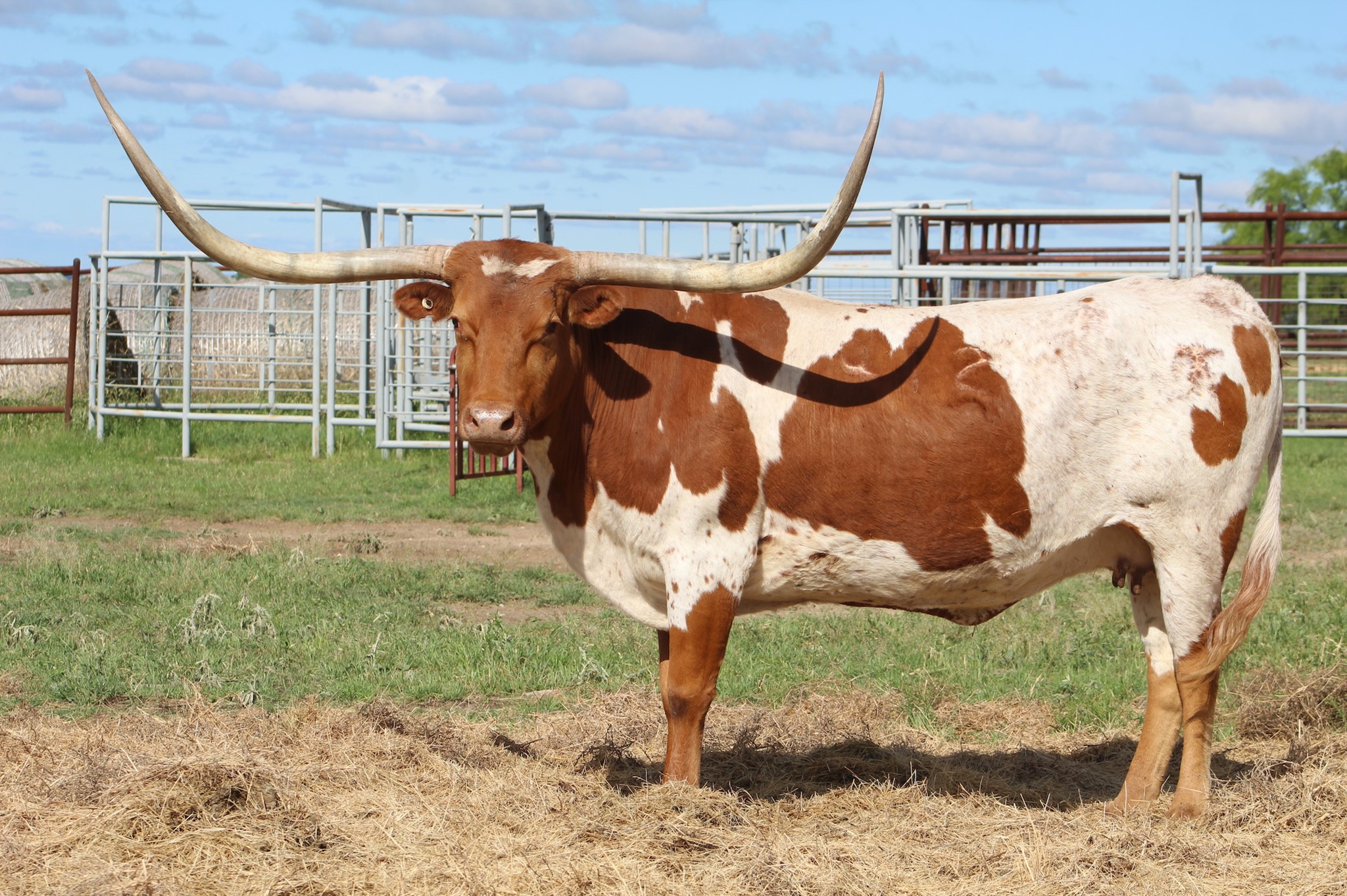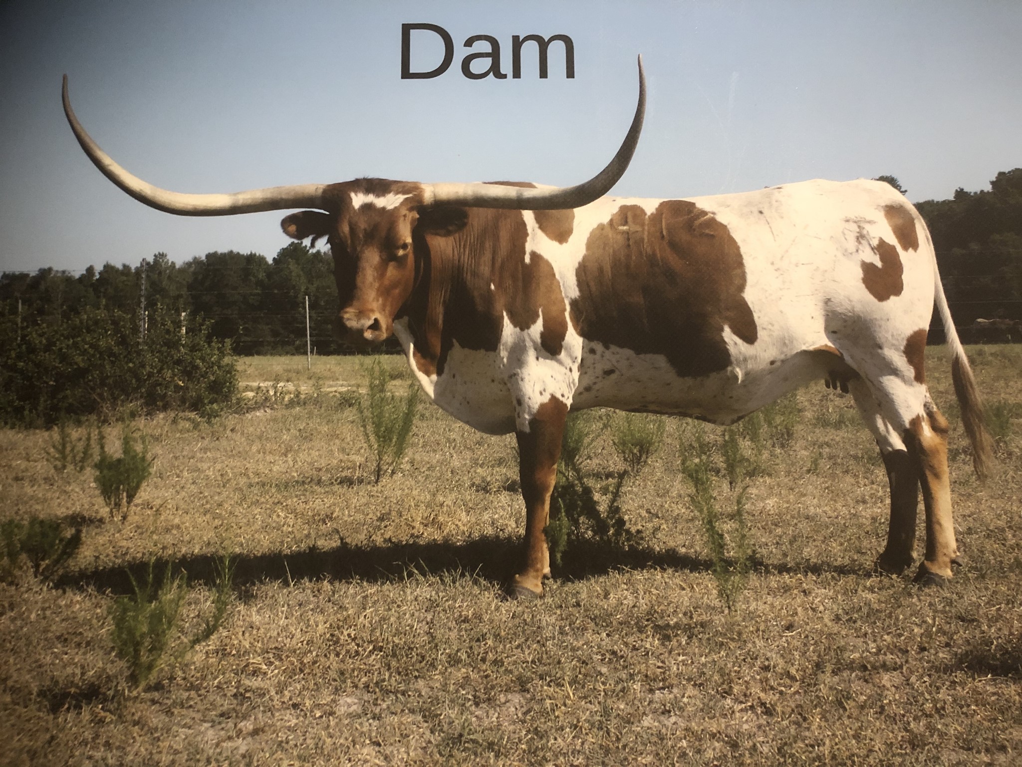 She is the dam to our partnership cow, May Ola. Riverforks Refined sports an absolute boat load of horn, with over 108" TH. She is exactly what we like in a cow; structurally sound, tall and long, excellent horn, and great disposition.