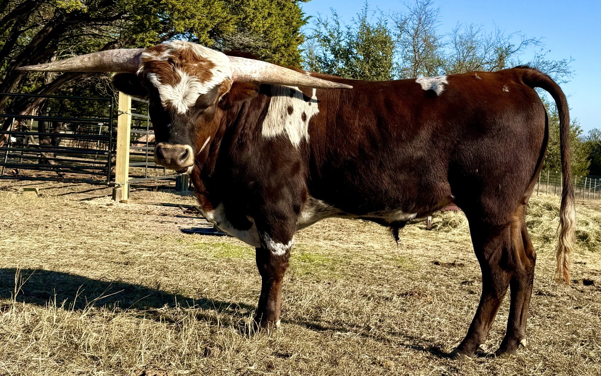 COMPLETE OUTCROSS!!! 60" at 20 mos!! Sired by Hired Hand, a multiple futurity winner measuring 86.5" at 3.5 years old, sporting a deep wine and black coat, accented with white patches, compliments of his daddy. Add his dam, Hubbells Super Nice, hitting over 93"TTT with head turning, smooth top and bottom conformation equals a boy who lives up to his name!! ... muscular hip for days and big bedroom eyes! Added genetic bonus: double bred JP Rio Grande, Higher Ground, with a dose of Hubbells Rio Glory, the dam of Hubbells 20 Gage. The genetics speak for themselves and are evident in Mr. Handsome. AND he is one of the first to stroll up to flirt with us. He loves his head scratches!! Easy to work and destined to be a calm, loving winner.