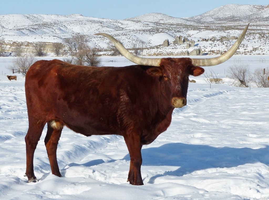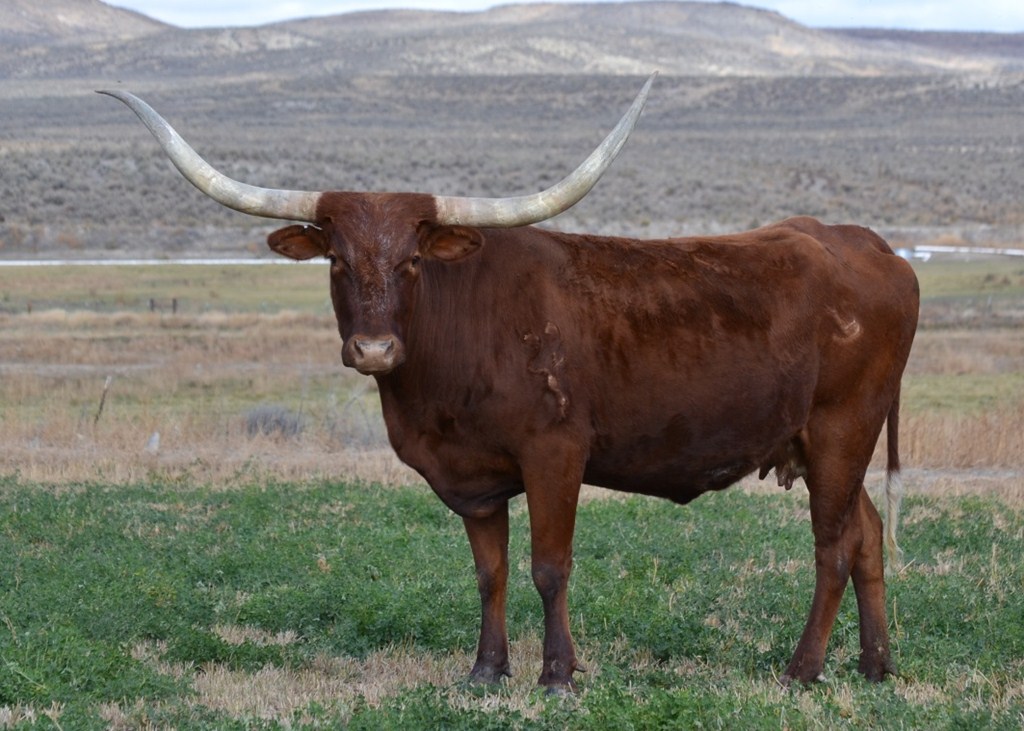 Big horned Gunsmoke daughter. She is a half sister to the great LLL Lucky (same dam) and throws tall, big horned calves. Steer at side by Pacific Cowboy born 4-17-21. Exposed to Hubbells Boss Hog for 2022