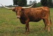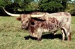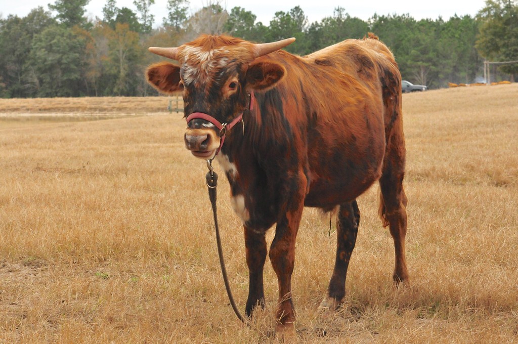 Brindle with white specs on face. Nice disposition; takes cubes from hand. Charming young steer, in process of being halter-broken.