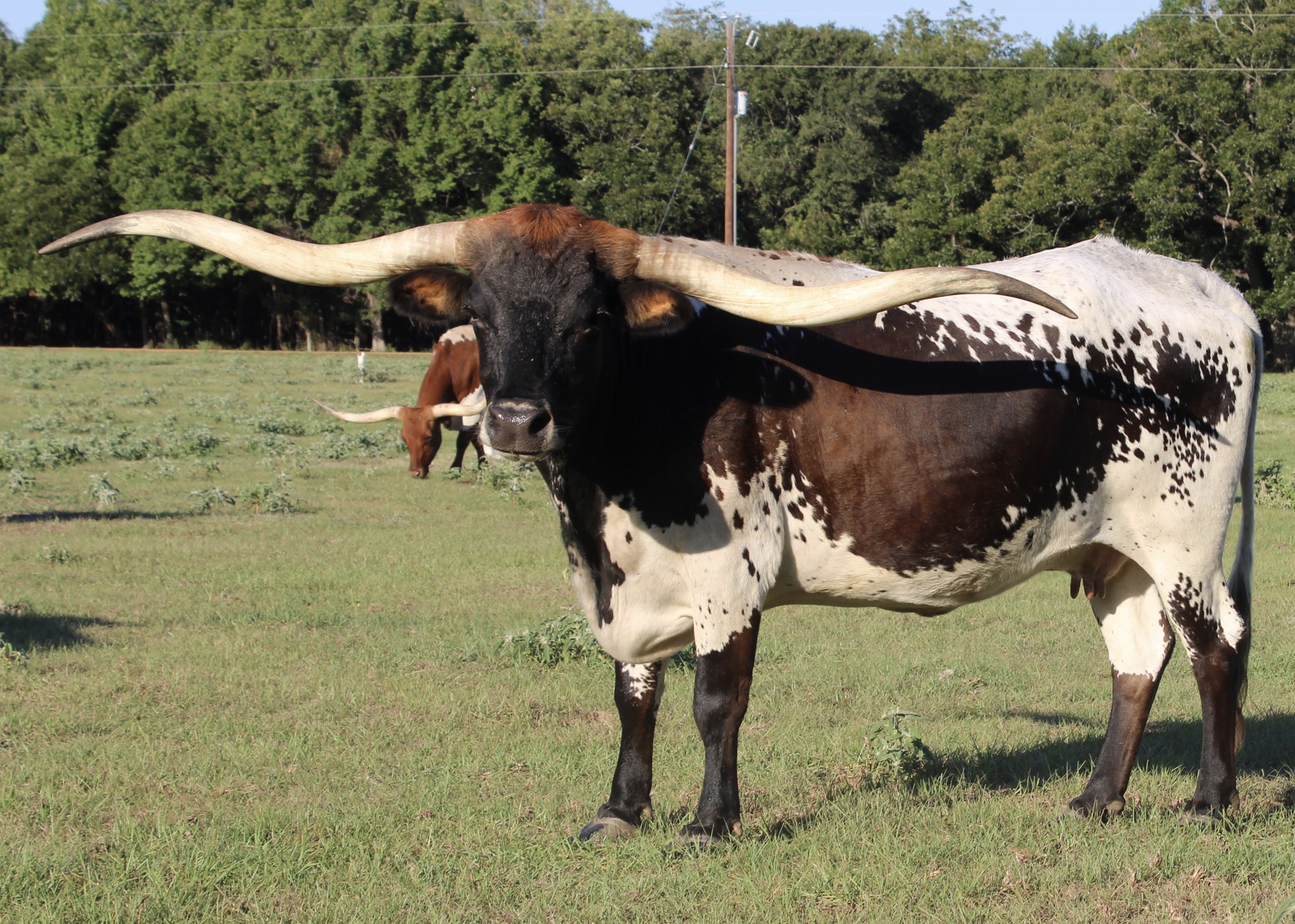 Corkscrew over 80" ttt twisty horned cow is a a real crowd pleaser. She is big bodied with low rolling horns. If you like color on your calves, this is the momma for you! Bred to Sniped, on 11/12/2022 she palpated 4-6 months.