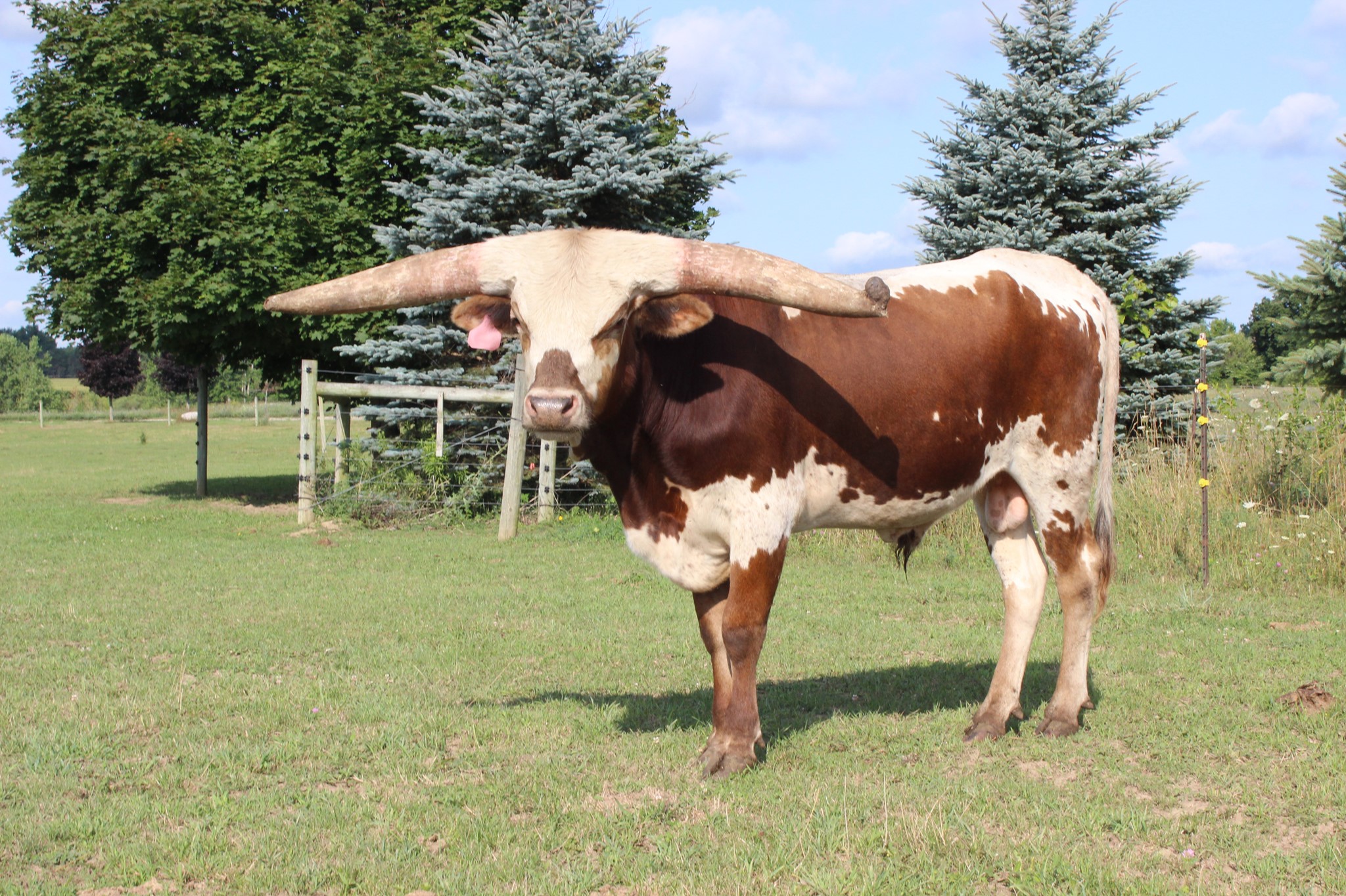 With 8.5" broke off his left horn and 5.5" broke off his right horn, he'd measure over 71"ttt at 23 months old without the horn damage!! Horn Genetics to the max with this Bull!. His full brother Carson, sold for $20,000.